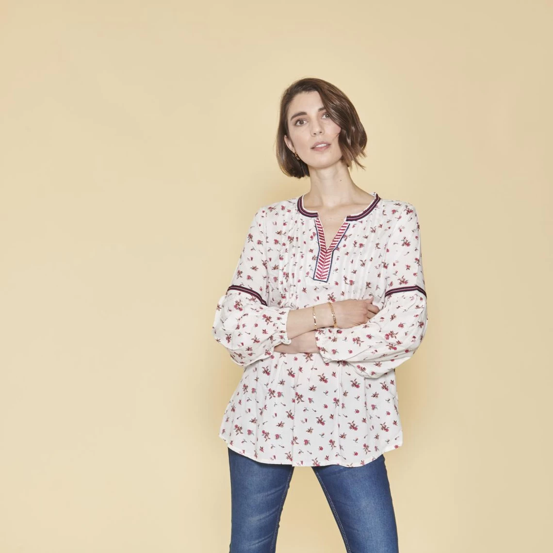 La passementerie, les jeux de plis et le délicat imprimé de cette blouse assurent un look des plus romantiques.