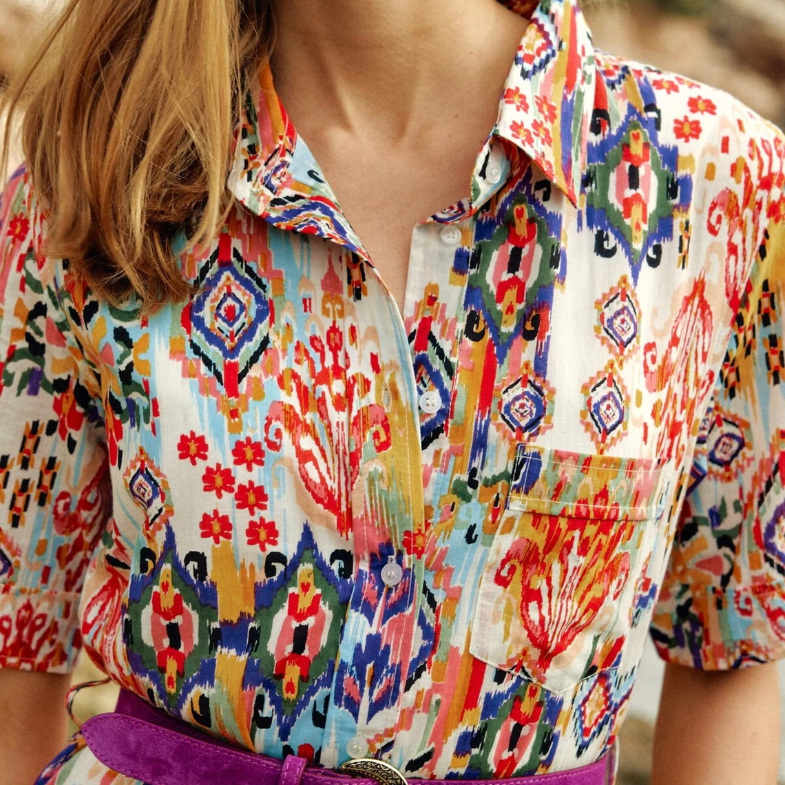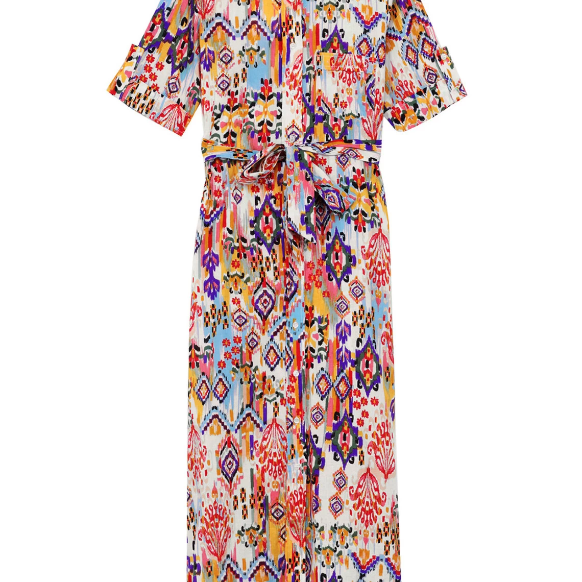 Laissez-vous séduire par cette Robe DAPHNEE longue qui déborde de féminité. Magnifiée par des motifs colorés, elle présente un col chemise et des manches courtes. Resserrée à la taille, elle s’accompagne d’une ceinture à nouer.