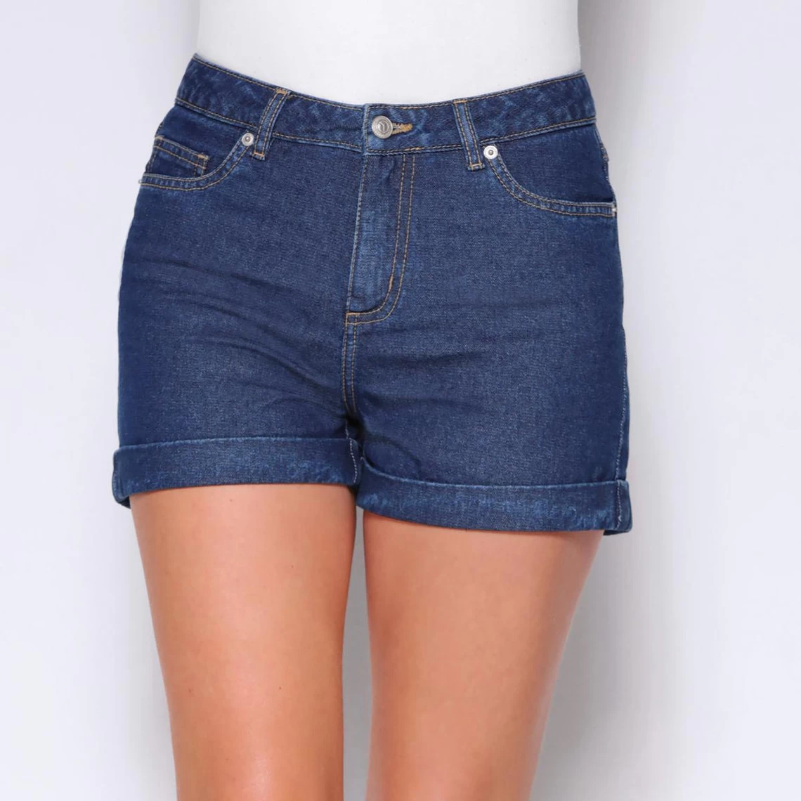Short. Coupe 5 poches. Passants à la taille. Fermeture par zip et bouton. Revers sur le bas. En jean aspect délavé. Longueur entrejambe 6 cm, largeur bas 32 cm.